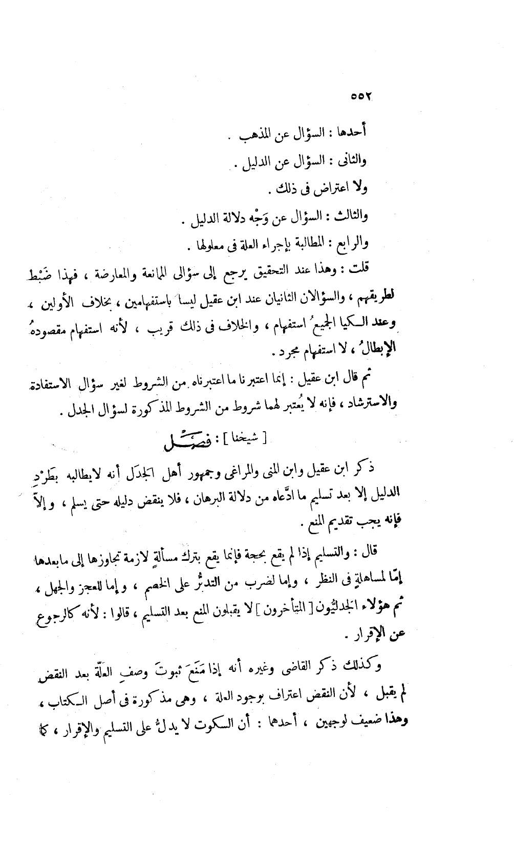 والرابع المطالبة بإجراء العلة في معلولها قلت: وهذا عند التحقيق يرجع إلى سؤ إلى الممانعة والمعارضة فهذا ضبط لطريقهم والسؤالان الثانيان عند ابن عقيل ليسا باستفهامين بخلاف الأولين وعند الكيا الجميع استفهام والخلاف في ذلك قريب لأنه استفهام مقصودة الإبطال لا استفهام مجرد.