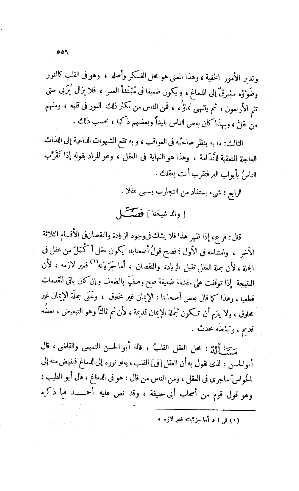 قال فرع إذا ظهر هذا فلا يشك في وجود الزيادة والنقصان في الأقسام الثلاثة الأخر وامتناعه في الأول فصح قول أصحابنا يكون عقل أكمل من عقل في الجملة لأن جملة العقل تقبل الزيادة والنقصان أما جريانه1 فغير لازمة لأن النتيجة إذا توقفت على مقدمة ضعيفة صح وصفها بالضعف وإن كان باقي المقدمات قطعيا وهذا كما قال بعض أصحابنا الإيمان غير مخلوق وعنى جملة الإيمان غير مخلوق ولا يلزم أن تكون جملة الإيمان قديمة لأن ثم ثالثا وهو التبعيض بعضه قديم وبعضه محدث.