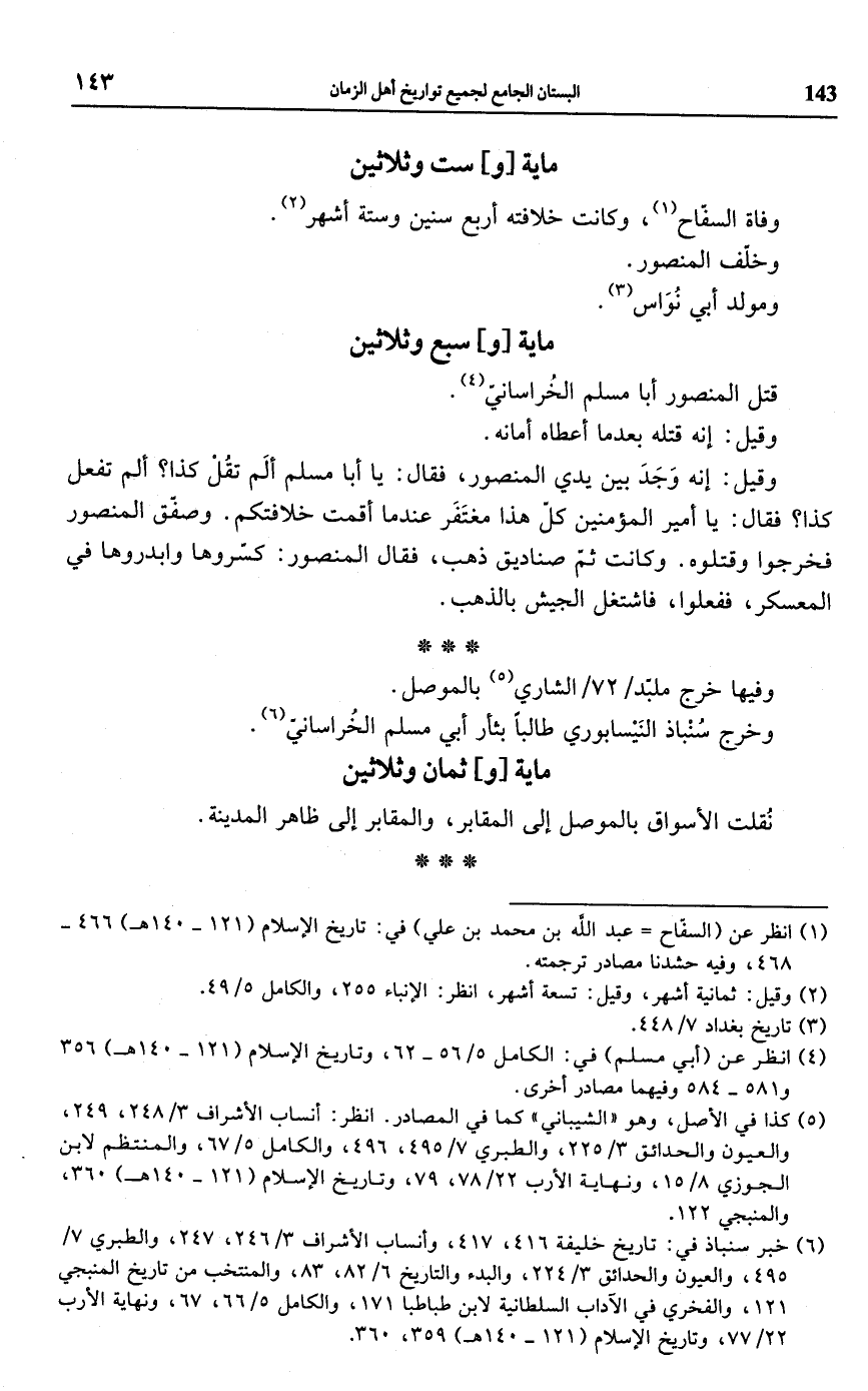 (¬1) انظر عن (السفّاح = عبد الله بن محمد بن علي) في: تاريخ الإسلام (121 - 140 هـ) 466 - 468، وفيه حشدنا مصادر ترجمته.