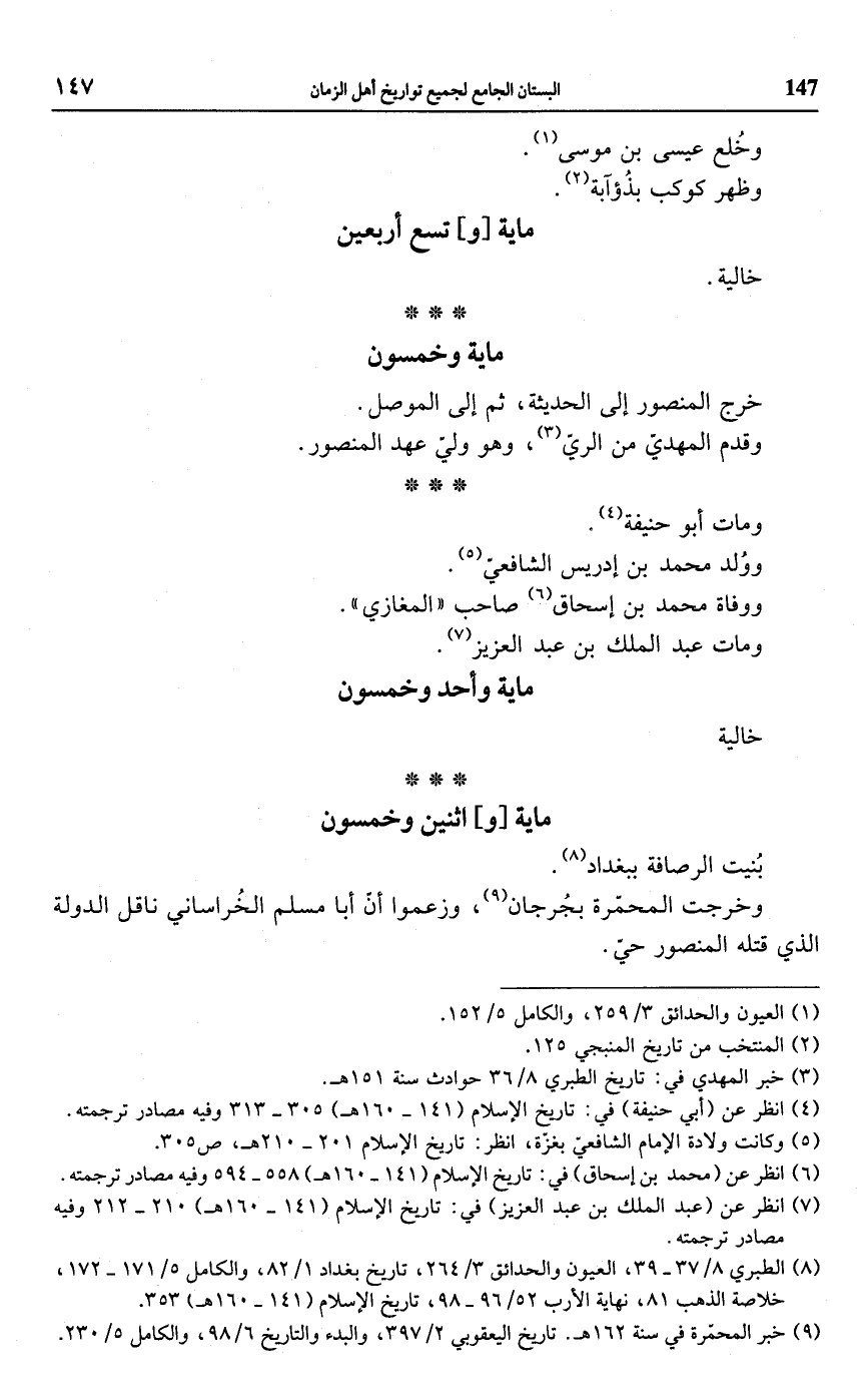 (¬8) الطبري 8/ 37 - 39، العيون والحدائق 3/ 264، تاريخ بغداد 1/ 82، والكامل 5/ 171 - 172، خلاصة الذهب 81، نهاية الأرب 52/ 96 - 98، تاريخ الإسلام (141 - 160 هـ) 353.