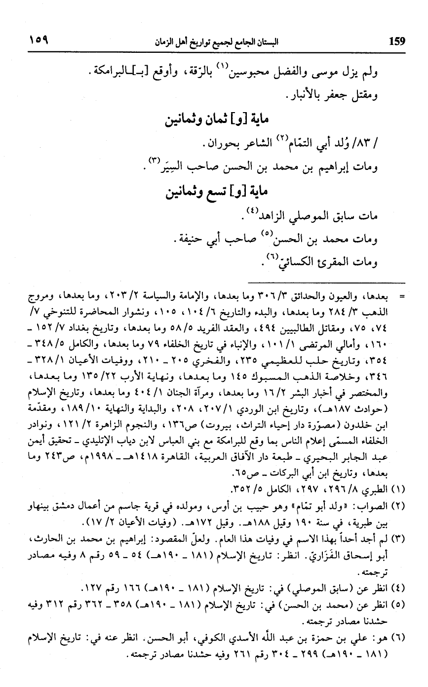 (¬2) الصواب: "ولد أبو تمّام" وهو حبيب بن أوس، ومولده في قرية جاسم من أعمال دمشق بينهاو بين طبرية، في سنة 190 وقيل 188 هـ. وقيل 172 هـ. (وفيات الأعيان 2/ 17).