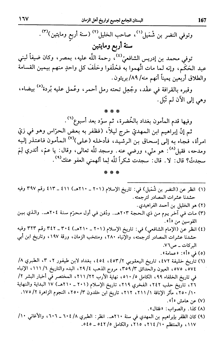 (¬1) انظر عن (النضر بن شُمَيل) في: تاريخ الإسلام (201 - 210 هـ) 411 - 413 رقم 397 وفيه حشدنا عشرات المصادر لترجمته.