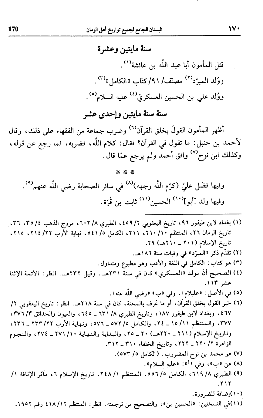 (¬6) خبر القول بخلق القرآن، أو ما عُرف بالمحنة، كان في سنة 218 هـ. انظر: تاريخ اليعقوبي 2/ 467، وبغداد لابن طيفور 187، وتاريخ الطبري 8/ 631 - 645، والعيون والحدائق 3/ 376، 377، والمنتظم 11/ 15 - 24، والكامل 5/ 572 - 576، ونهاية الأرب 22/ 233 - 236، وتاريخ الإسلام (211 - 220 هـ) 20 - 25، والبداية والنهاية 10/ 271 - 274، والنجوم الزاهرة 2/ 220 - 222، وتاريخ الخلفاء 310 - 312.