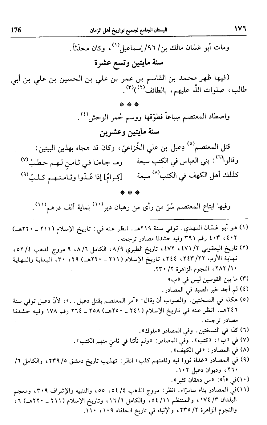 (¬5) هكذا في النسختين. والصواب أن يقال: "أمر المعتصم بقتل دعبل .. "، لأن دعبل توفي سنة 246 هـ. انظر عنه في تاريخ الإسلام (241 - 250 هـ) 258 - 264 رقم 178 وفيه حشدنا مصادر ترجمته.