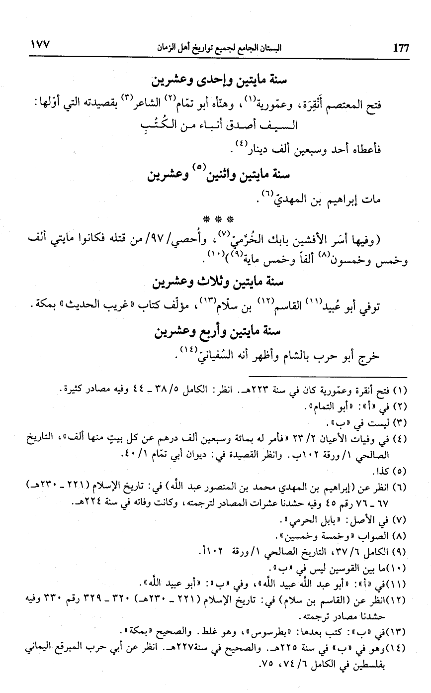 (¬4) في وفيات الأعيان 2/ 23 "فأمر له بمائة وسبعين ألف درهم عن كل بيتٍ منها ألف"، التاريخ الصالحي 1/ ورقة 102 ب. وانظر القصيدة في: ديوان أبي تمَّام 1/ 40.