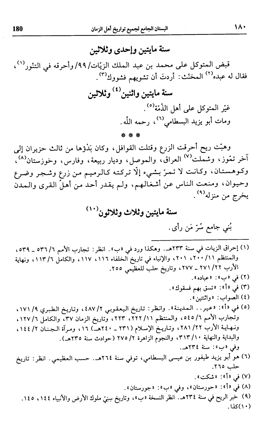 (¬1) إحراق الزيات في سنة 233 هـ. وهكذا ورد في "ب". انظر: تجارب الأمم 6/ 536 - 539، والمنتظم 11/ 200، 201، والإنباء في تاريخ الخلفاء 116، 117، والكامل 6/ 113، ونهاية الأرب 22/ 271 - 277، وتاريخ حلب للعظيمي 255.