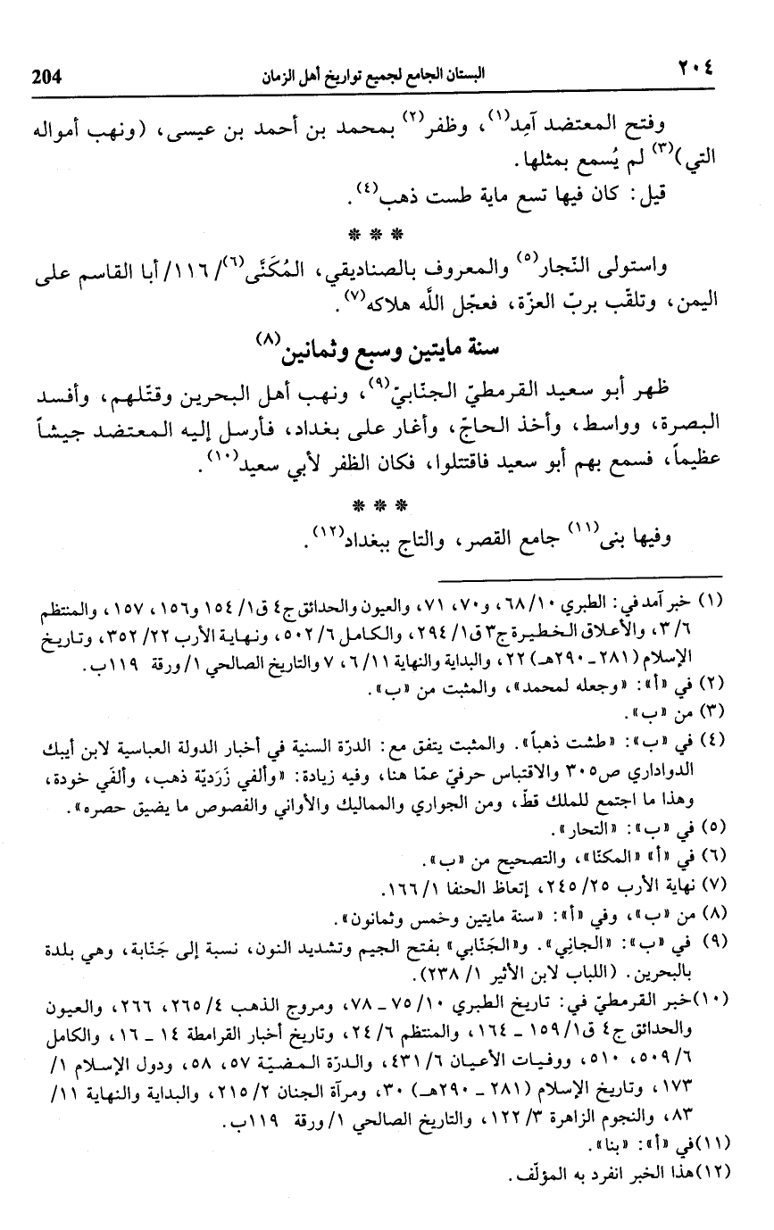 (¬10) خبر القرمطيّ في: تاريخ الطبري 10/ 75 - 78، ومروج الذهب 4/ 265، 266، والعيون والحدائق ج 4 ق 1/ 159 - 164، والمنتظم 6/ 24، وتاريخ أخبار القرامطة 14 - 16، والكامل 6/ 509، 510، ووفيات الأعيان 6/ 431، والدرّة المضيّة 57، 58، ودول الإسلام 1/ 173، وتاريخ الإسلام (281 - 290 هـ) 30، ومرآة الجنان 2/ 215، والبداية والنهاية 11/ 83، والنجوم الزاهرة 3/ 122، والتاريخ الصالحي 1/ ورقة 119 ب.