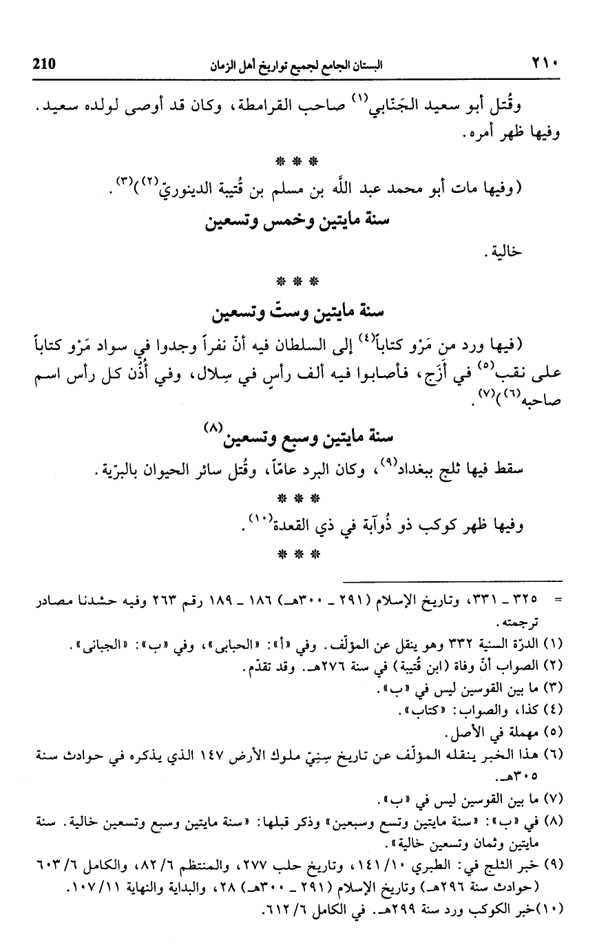 (¬9) خبر الثلج في: الطبري 10/ 141، وتاريخ حلب 277، والمنتظم 6/ 82، والكامل 6/ 603 (حوادث سنة 296 هـ) وتاريخ الإسلام (291 - 300 هـ) 28، والبداية والنهاية 11/ 107.