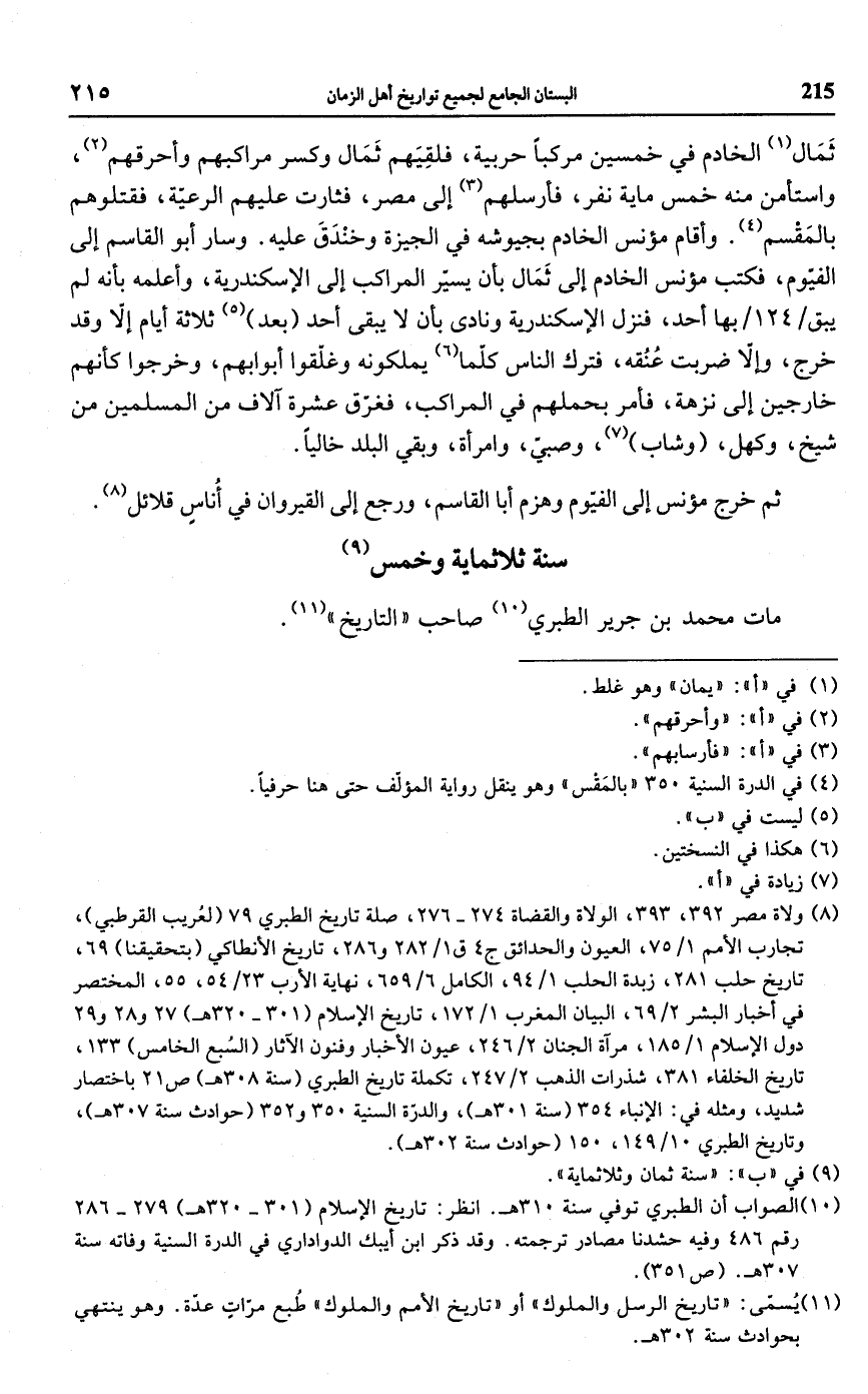 (¬10) الصواب أن الطبري توفي سنة 310 هـ. انظر: تاريخ الإسلام (301 - 320 هـ) 279 - 286 رقم 486 وفيه حشدنا مصادر ترجمته. وقد ذكر ابن أيبك الدواداري في الدرة السنية وفاته سنة 307 هـ. (ص 351).