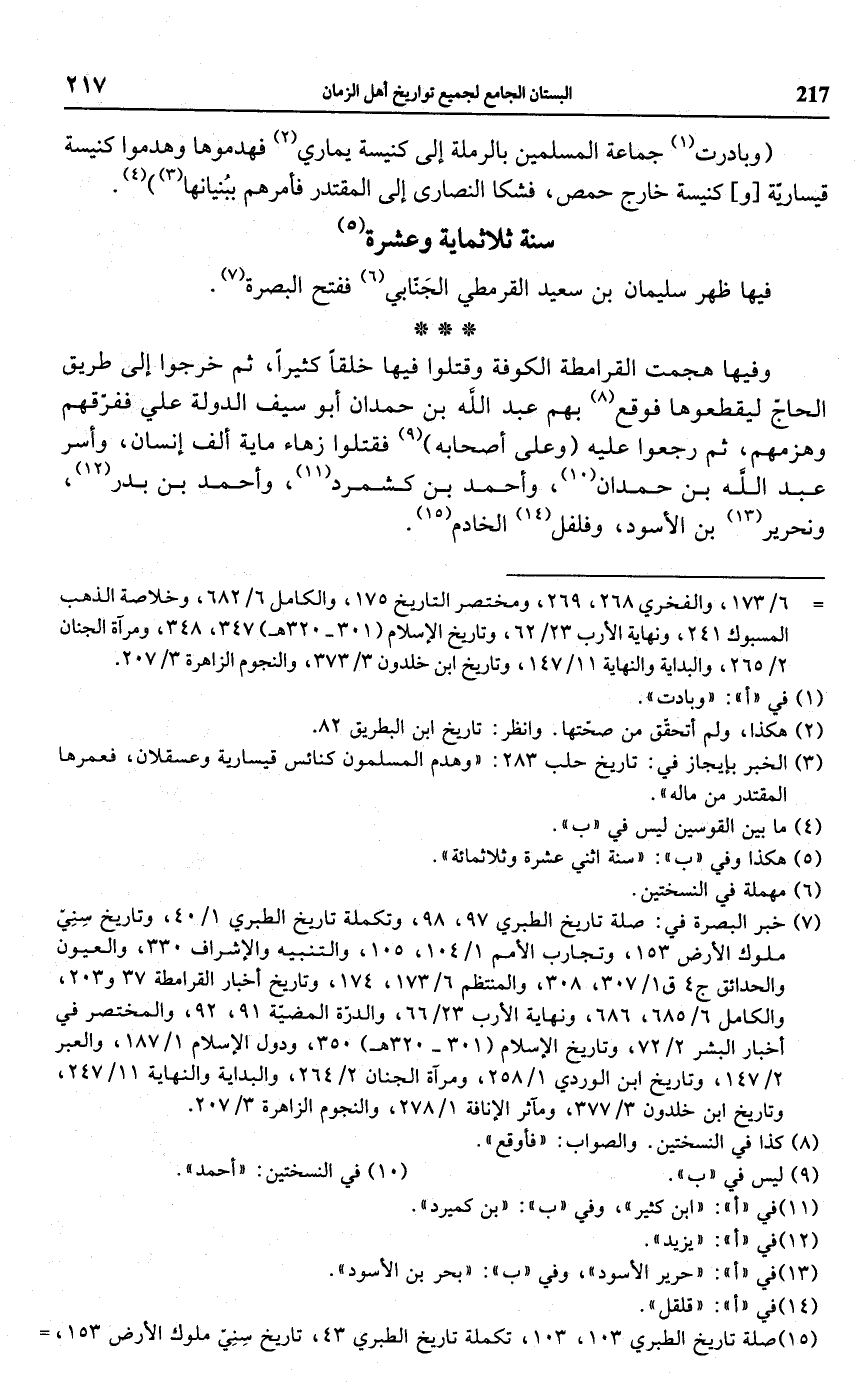 (¬7) خبر البصرة في: صلة تاريخ الطبري 97، 98، وتكملة تاريخ الطبري 1/ 40، وتاريخ سِنِيّ ملوك الأرض 153، وتجارب الأمم 1/ 104، 105، والتنبيه والإشراف 330، والعيون والحدائق ج 4 ق 1/ 307، 308، والمنتظم 6/ 173، 174، وتاريخ أخبار القرامطة 37 و 203، والكامل 6/ 685، 686، ونهاية الأرب 23/ 66، والدرّة المضية 91، 92، والمختصر في أخبار البشر 2/ 72، وتاريخ الإسلام (301 - 320 هـ) 350، ودول الإسلام 1/ 187، والعبر 2/ 147، وتاريخ ابن الوردي 1/ 258، ومرآة الجنان 2/ 264، والبداية والنهاية 11/ 247، وتاريخ ابن خلدون 3/ 377، ومآثر الإنافة 1/ 278، والنجوم الزاهرة 3/ 207.