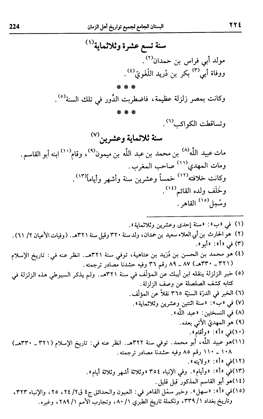 (¬5) خبر الزلزلة ينقله ابن أيبك عن المؤلّف في سنة 321 هـ. ولم يذكر السيوطى هذه الزلزلة في كتابه كشف الصلصلة عن وصف الزلزلة.