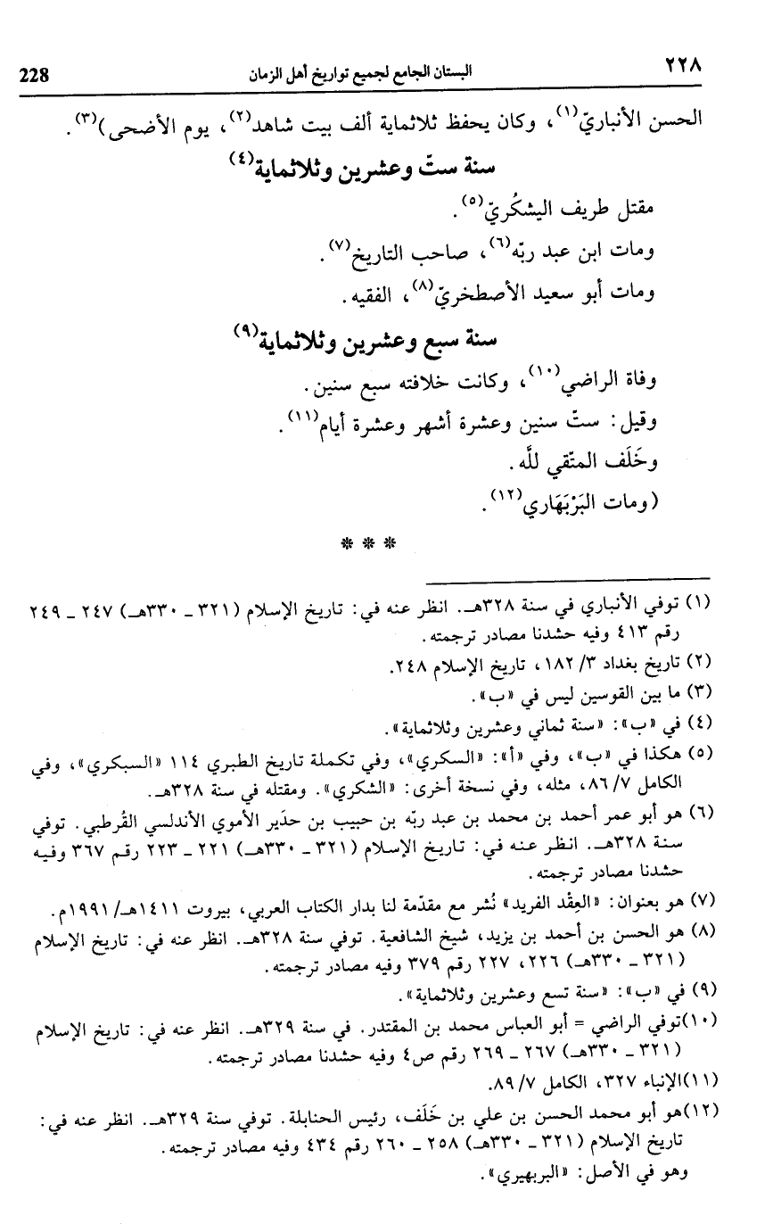 (¬10) توفي الراضي = أبو العباس محمد بن المقتدر. في سنة 329 هـ. انظر عنه في: تاريخ الإسلام (321 - 330 هـ) 267 - 269 رقم ص 4 وفيه حشدنا مصادر ترجمته.