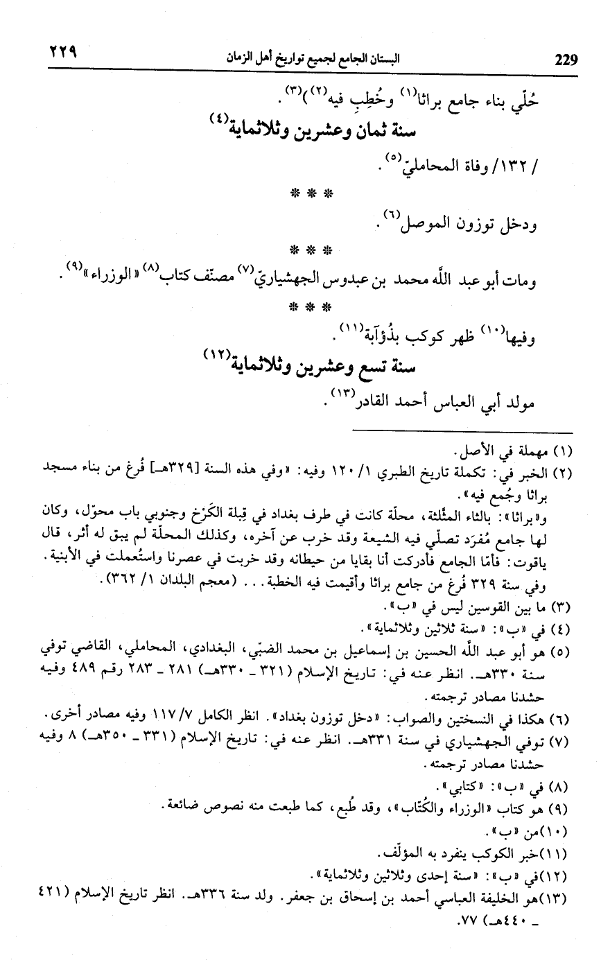 (¬2) الخبر في: تكملة تاريخ الطبري 1/ 120 وفيه: "وفي هذه السنة [329 هـ]، فُرغ من بناء مسجد براثا وجُمع فيه". و"براثا": بالثاء المثلثّة، محلّة كانت في طرف بغداد في قِبلة الكَرْخ وجنوبي باب محوّل، وكان لها جامع مُفرَد تصلّي فيه الشيعة وقد خرب عن آخره، وكذلك المحلّة لم يبق له أثر، قال ياقوت: فأمّا الجامع فأدركت أنا بقايا من حيطانه وقد خربت في عصرنا واستُعملت في الأبنية.