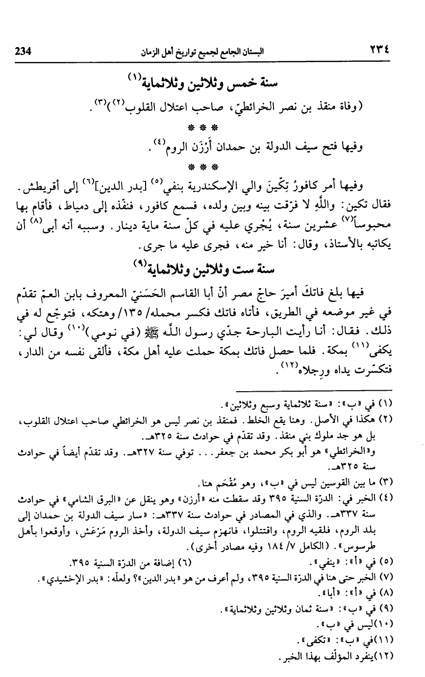 (¬2) هكذا في الأصل. وهنا يقع الخلط. فمنقذ بن نصر ليس هو الخرائطي صاحب اعتلال القلوب، بل هو جد ملوك بني منقذ. وقد تقدّم في حوادث سنة 325 هـ.