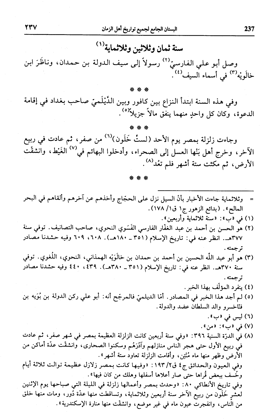 وفي العيون والحدائق ج 4 ق 2/ 193: "وفيها كانت بمصر زلازل عظيمة توالت ثلاثة أيام وخُسف ببعض قُراها حتى صار أعلاها أسفلها وهلك من كان فيها". وفي تاريخ الأنطاكي 80: "وحدث بمصر وأعمالها زلزلة في الليلة التي صباحها يوم الإثنين لعشبر خَلَون من ربيع الآخر سنة أربعين وثلاثماية، وتساقطت منها عدّة دُور، ومات منها خلق من الناس، وانفجرت عيون ماء في غير موضع، وانشقّت منها منارة الإسكندرية".
