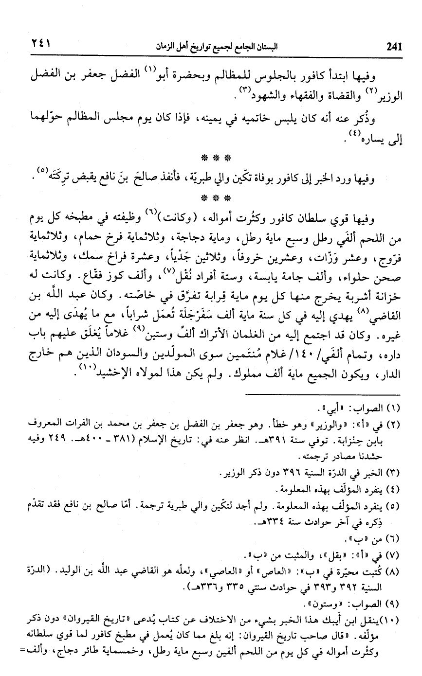 (¬10) ينقل ابن أَيبك هذا الخبر بشيء من الاختلاف عن كتاب يُدعى "تاريخ القيروان" دون ذكر مؤلّفه. "قال صاحب تاريخ القيروان: إنه بلغ مما كان يُعمل في مطبخ كافور لما قوي سلطانه وكثُرت أمواله في كل يوم من اللحم ألفين وسبع ماية رطل، وخمسماية طائر دجاج، وألف=