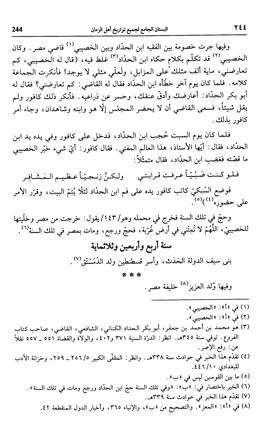 وفيها جرت خصومة بين الفقيه ابن الحدّاد وبين الخصيبي (¬1) قاضي مصر. وكان الخصيبي (¬2) قد تكلّم بكلامٍ حكاه ابن الحدّاد (¬3) غلط فيه، (قال له الخصيبي، كم تعارضني، ماية ألف مثلك على المزابل، ولَعلّي مثلي لا يوجد! فأنكرت الجماعة كلامه. فلما كان يوم آخر خطّأه ابن الحدّاد فقال له القاضي: كم تعارضني؟ فقال له أبو بكر الحدّاد: أعارضك وأدقّ عنقك، وحسر عن ذراعيه. فأنكر ذلك كافور ولم يقل شيئاً، فسعى القاضي أن لا يحضر المجلس إلّا هو وابنه وشاهدان، وجاء أمر كافور بذلك.