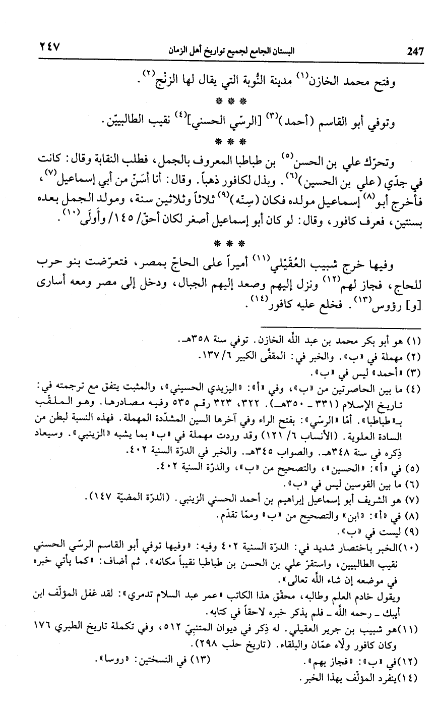 (¬4) ما بين الحاصرتين من "ب"، وفي "أ": "اليزيدي الحسيني"، والمثبت يتفق مع ترجمته في: تاريخ الإسلام (331 - 350 هـ). 322، 323 رقم 535 وفيه مصادرها. وهو الملقّب بـ "طباطبا". أمّا "الرسّي": بفتح الراء وفي آخرها السين المشدّدة المهملة. فهذه النسبة لبطن من السادة العلوية. (الأنساب 6/ 121) وقد وردت مهملة في "ب" بما يشبه "الزينبي". وسيعاد ذِكره في سنة 348 هـ. والصواب 345 هـ. والخبر في الدرّة السنية 402.