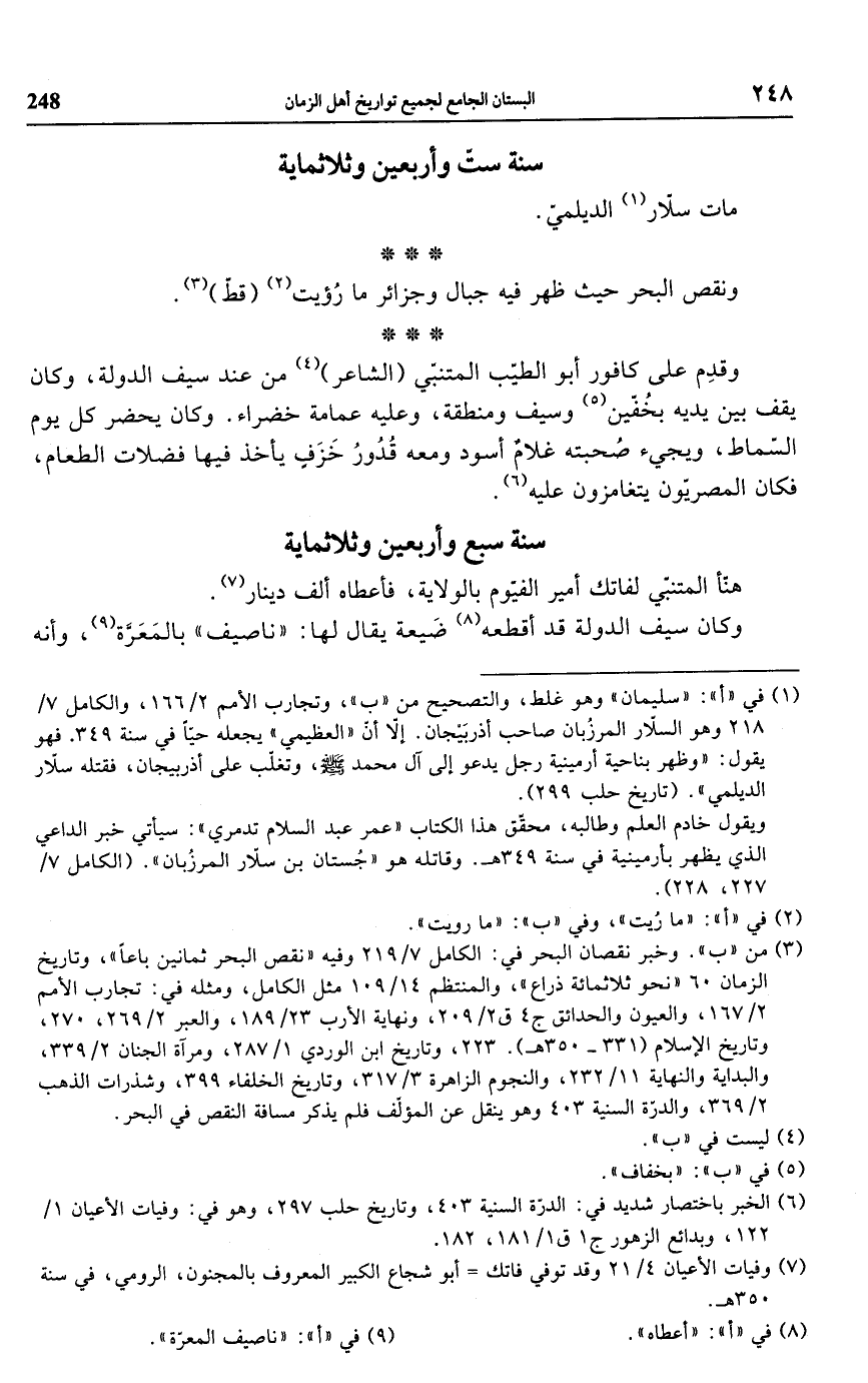 (¬1) في "أ": "سليمان" وهو غلط، والتصحيح من "ب"، وتجارب الأمم 2/ 166، والكامل 7/ 218 وهو السلّار المرزُبان صاحب أذربَيْجان. إلّا أنّ "العظيمي" يجعله حيّاً في سنة 349. فهو يقول: "وظهر بناحية أرمينية رجل يدعو إلى آل محمد - صلى الله عليه وسلم -، وتغلّب على أذربيجان، فقتله سلّار الديلمي". (تاريخ حلب 299).