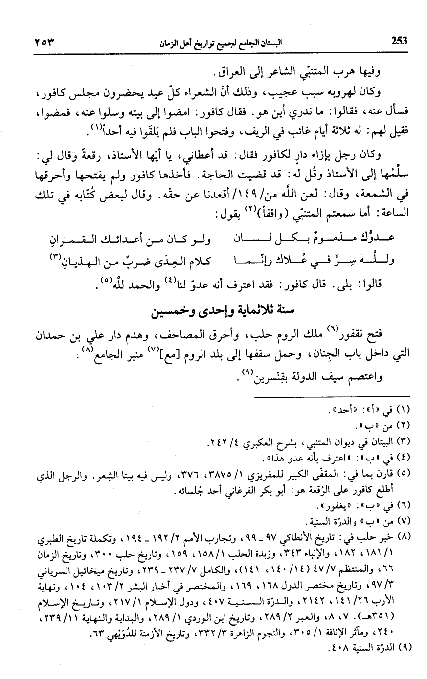 (¬8) خبر حلب في: تاريخ الأنطاكي 97 - 99، وتجارب الأمم 2/ 192 - 194، وتكملة تاريخ الطبري 1/ 181، 182، والإنباء 343، وزبدة الحلب 1/ 158، 159، وتاريخ حلب 300، وتاريخ الزمان 66، والمنتظم 7/ 47 (14/ 140، 141)، والكامل 7/ 237 - 239، وتاريخ ميخائيل السرياني 3/ 97، وتاريخ مختصر الدول 168، 169، والمختصر في أخبار البشر 2/ 103، 104، ونهاية الأرب 26/ 141، 2142، والدرّة السنية 407، ودول الإسلام 1/ 217، وتاريخ الإسلام (351 هـ) 7، 8، والعبر 2/ 289، وتاريخ ابن الوردي 1/ 289، والبداية والنهاية 11/ 239، 240، ومآثر الإنافة 1/ 305، والنجوم الزاهرة 3/ 332، وتاريخ الأزمنة للدُوَيْهي 63.