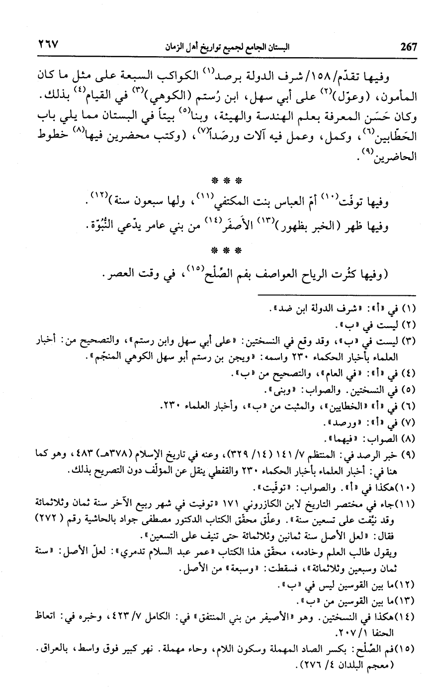 (¬9) خبر الرصد في: المنتظم 7/ 141 (14/ 329)، وعنه في تاريخ الإِسلام (378 هـ) 483، وهو كما هنا في: أخبار العلماء بأخبار الحكماء 230 والقفطي ينقل عن المؤلّف دون التصريح بذلك.