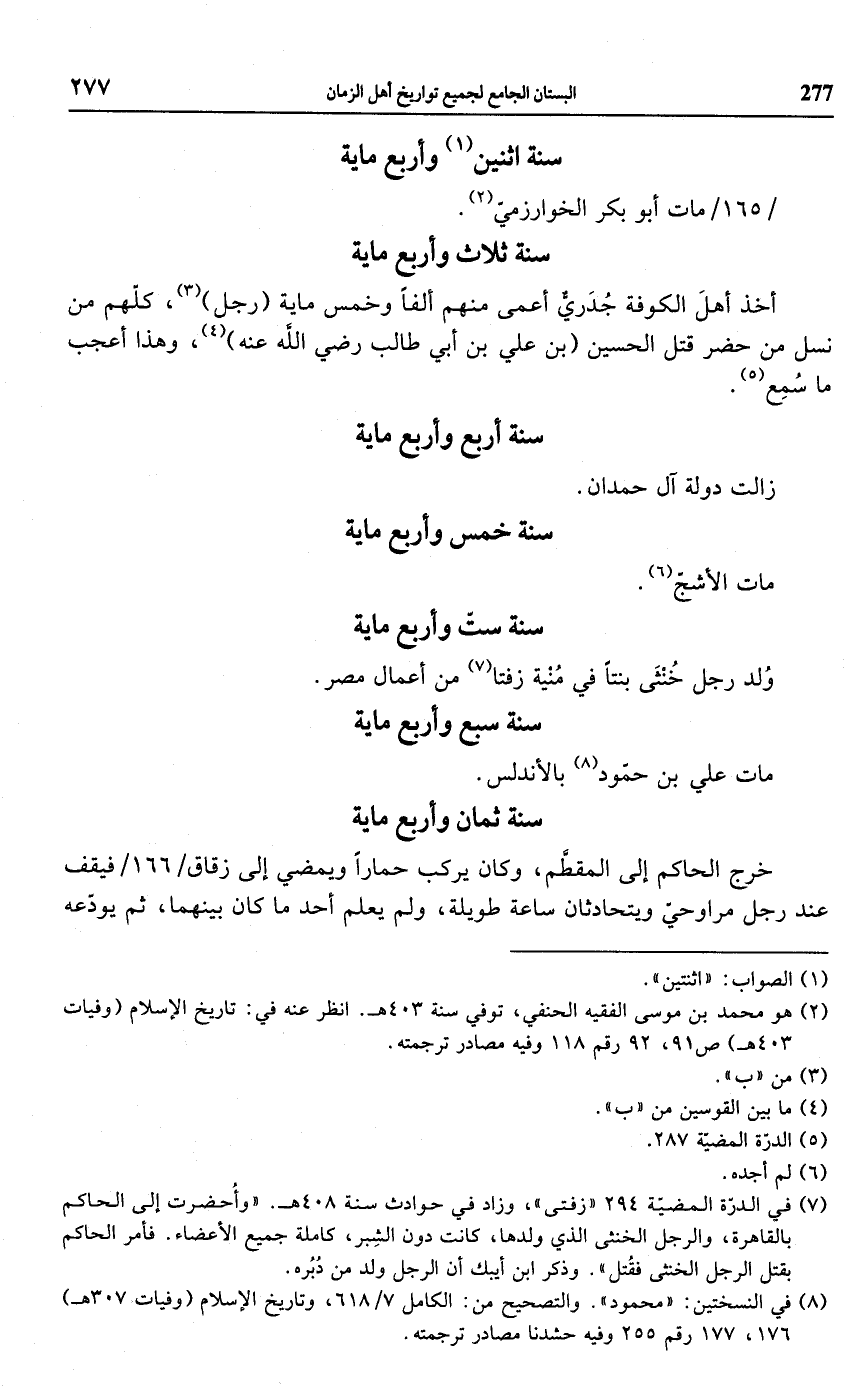 (¬7) في الدرّة المضيّة 294 "زفتى"، وزاد في حوادث سنة 408 هـ. "وأُحضرت إلى الحاكم بالقاهرة، والرجل الخنثى الذي ولدها، كانت دون الشِبر، كاملة جميع الأعضاء. فأمر الحاكم بقتل الرجل الخنثى فقُّتل". وذكر ابن أيبك أن الرجل ولد من دُبُره.