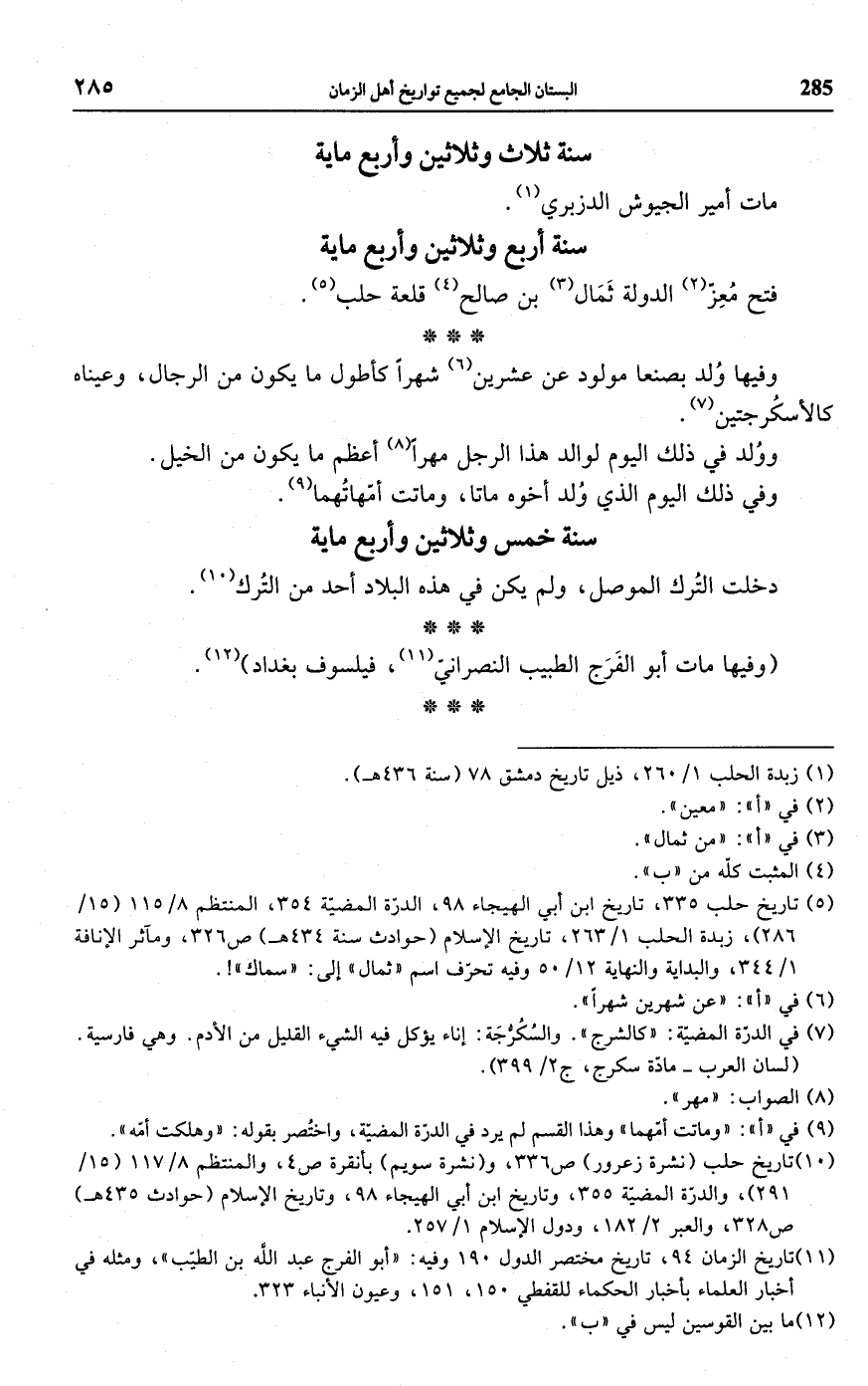 (¬10) تاريخ حلب (نشرة زعرور) ص 336، و (نشرة سويم) بأنقرة ص 4، والمنتظم 8/ 117 (15/ 291)، والدرّة المضيّة 355، وتاريخ ابن أبي الهيجاء 98، وتاريخ الإِسلام (حوادث 435 هـ) ص 328، والعبر 2/ 182، ودول الإِسلام 1/ 257.