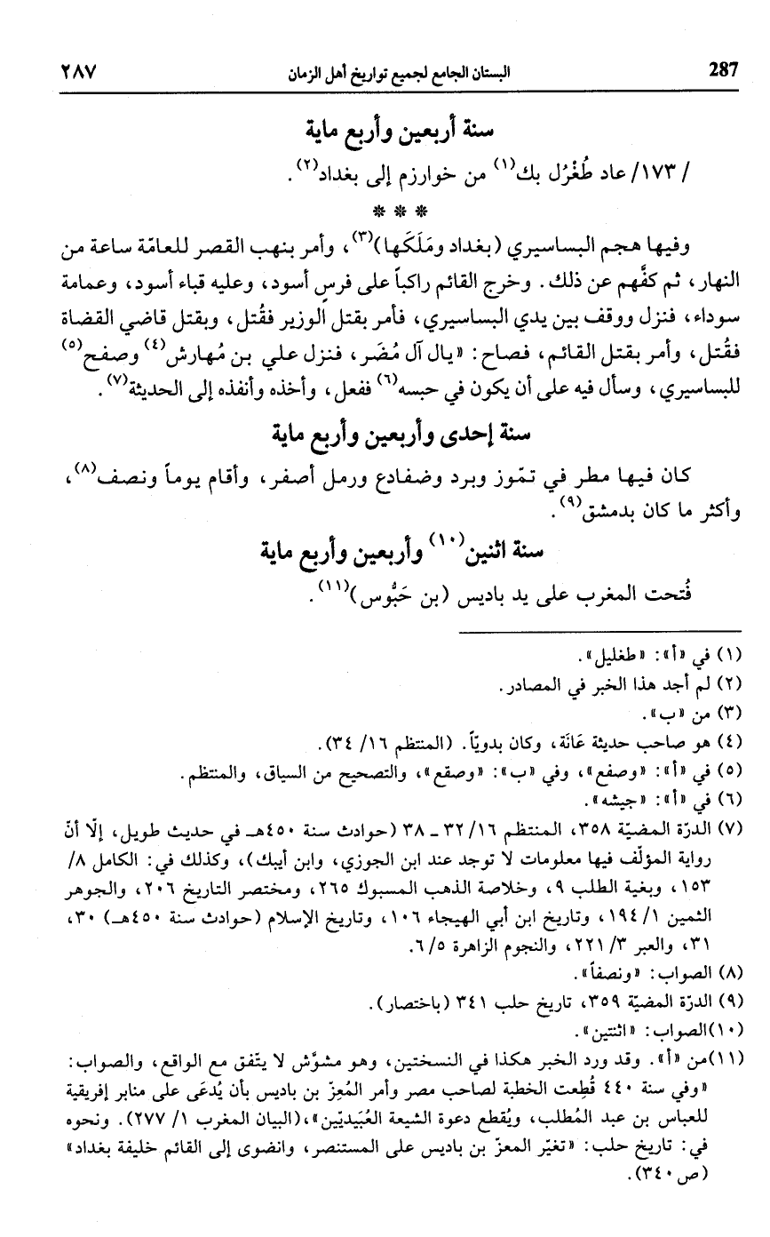 وفيها هجم البساسيري (بغداد ومَلَكَها) (¬3)، وأمر بنهب القصر للعامّة ساعة من النهار، ثم كفَّهم عن ذلك. وخرج القائم راكبًا على فرسٍ أسود، وعليه قباء أسود، وعمامة سوداء، فنزل ووقف بين يدي البساسيري، فأمر بقتل الوزير فقُتل، وبقتل قاضي القضاة فقُتل، وأمر بقتل القائم، فصاح: "يال آل مُضَر، فنزل علي بن مُهارش (¬4) وصفح (¬5) للبساسيري، وسأل فيه على أن يكون في حبسه (¬6) ففعل، وأخذه وأنفذه إلى الحديثة (¬7).