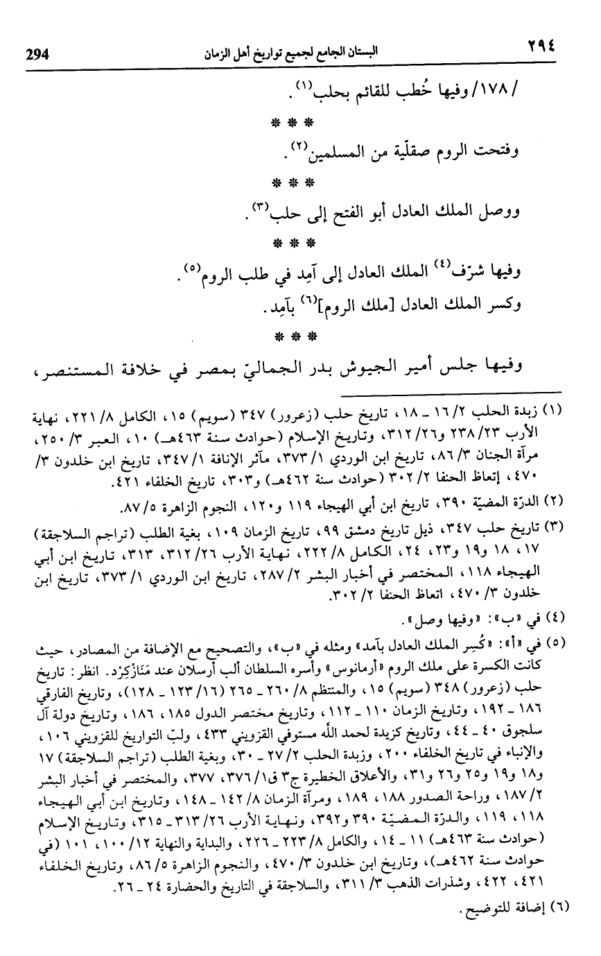 (¬5) في "أ": "كُسِر الملك العادل بآمد" ومثله في "ب"، والتصحيح مع الإضافة من المصادر، حيث كانت الكسرة على ملك الروم "أرمانوس" وأسره السلطان ألب أرسلان عند مَنَازْكِرْد. انظر: تاريخ حلب (زعرور) 348 (سويم) 15، والمنتظم 8/ 260 - 265 (16/ 123 - 128)، وتاريخ الفارقي 186 - 192، وتاريخ الزمان 110 - 112، وتاريخ مختصر الدول 185، 186، وتاريخ دولة آل سلجوق 40 - 44، وتاريخ كزيدة لحمد الله مستوفي القزويني 433، ولبّ التواريخ للقزويني 106، والإنباء في تاريخ الخلفاء 200، وزبدة الحلب 2/ 27 - 30، وبغية الطلب (تراجم السلاجقة) 17 و 18 و 19 و 20 و 26 و 31، والأعلاق الخطيرة ج 3 ق 1/ 376، 377، والمختصر في أخبار البشر 2/ 187، وراحة الصدور 188، 189، ومرآة الزمان 8/ 142 - 148، وتاريخ ابن أبي الهيجاء 118، 119، والدرّة المضيّة 390 و 392، ونهاية الأرب 26/ 313 - 315، وتاريخ الإِسلام (حوادث سنة 463 هـ) 11 - 14، والكامل 8/ 223 - 226، والبداية والنهاية 12/ 100، 101 (في حوادث سنة 462 هـ)، وتاريخ ابن خلدون 3/ 470، والنجوم الزاهرة 5/ 86، وتاريخ الخلفاء 421، 422، وشذرات الذهب 3/ 311، والسلاجقة في التاريخ والحضارة 24 - 26.