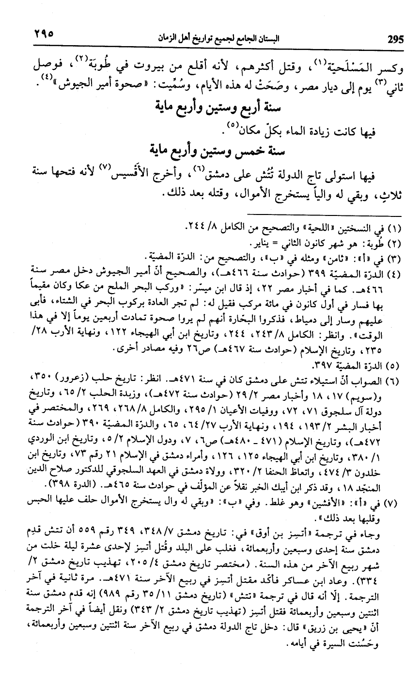 (¬6) الصواب أنَّ استيلاء تتش على دمشق كان في سنة 471 هـ. انظر: تاريخ حلب (زعرور) 350، و (سويم) 17، 18 وأخبار مصر 2/ 29 (حوادث سنة 472 هـ)، وزبدة الحلب 2/ 65، وتاريخ دولة آل سلجوق 71، 72، ووفيات الأعيان 1/ 295، والكامل 8/ 268، 269، والمختصر في أخبار البشر 2/ 193، 194، ونهاية الأرب 27/ 64، 65، والدرّة المضيّة 390 (حوادث سنة 472 هـ)، وتاريخ الإسلام (471 - 480 هـ) ص 6، 7، ودول الإِسلام 2/ 5، وتاريخ ابن الوردي 1/ 380، وتاريخ ابن أبي الهيجاء 125، 126، وأمراء دمشق في الإِسلام 21 رقم 73، وتاريخ ابن خلدون 3/ 474، واتعاظ الحنفا 2/ 320، وولاة دمشق في العهد السلجوقي للدكتور صلاح الدين المنجّد 18، وقد ذكر ابن أبيبك الخبر نقلًا عن المؤلّف في حوادث سنة 465 هـ. (الدرة 398).