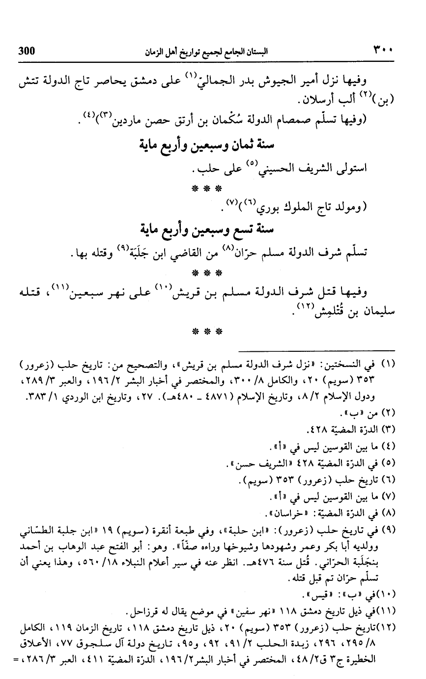 (¬9) في تاريخ حلب (زعرور): "ابن حلبة"، وفي طبعة أنقرة (سويم) 19 "ابن جلبة الطسّاني وولديه أبا بكر وعمر وشهودها وشيوخها وراءه صفًّا". وهو: أبو الفتح عبد الوهاب بن أحمد بنجَلَبة الحرّاني. قُتل سنة 476 هـ. انظر عنه في سير أعلام النبلاء 18/ 560، وهذا يعني أن تسلّم حرّان تم قبل قتله.