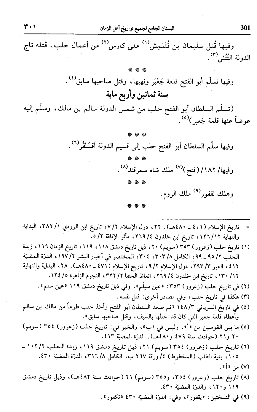 (¬4) في تاريخ السرياني 3/ 148 "ثم صعد السلطان أبو الفتح وأخذ حلب طوعًا من مالك بن سالم وأعطاه قلعة جعبر التي كان قد احتلّها بالسيف، وقتل صاحبها سابق".