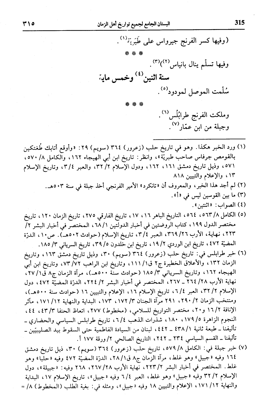 (¬1) ورد الخبر هكذا. وهو في تاريخ حلب (زعرور) 364 (سويم) 29: "وأوقع أتابك طُغتكين بالقومص جرفاس صاحب طبريّة"، وانظر: تاريخ ابن أبي الهيجاء 162، والكامل 8/ 570، 571، وذيل تاريخ دمشق 161، 162، ودول الإسلام 2/ 32، والعبر 4/ 3، وتاريخ الإسلام 13، والإعلام والتبيين 818.