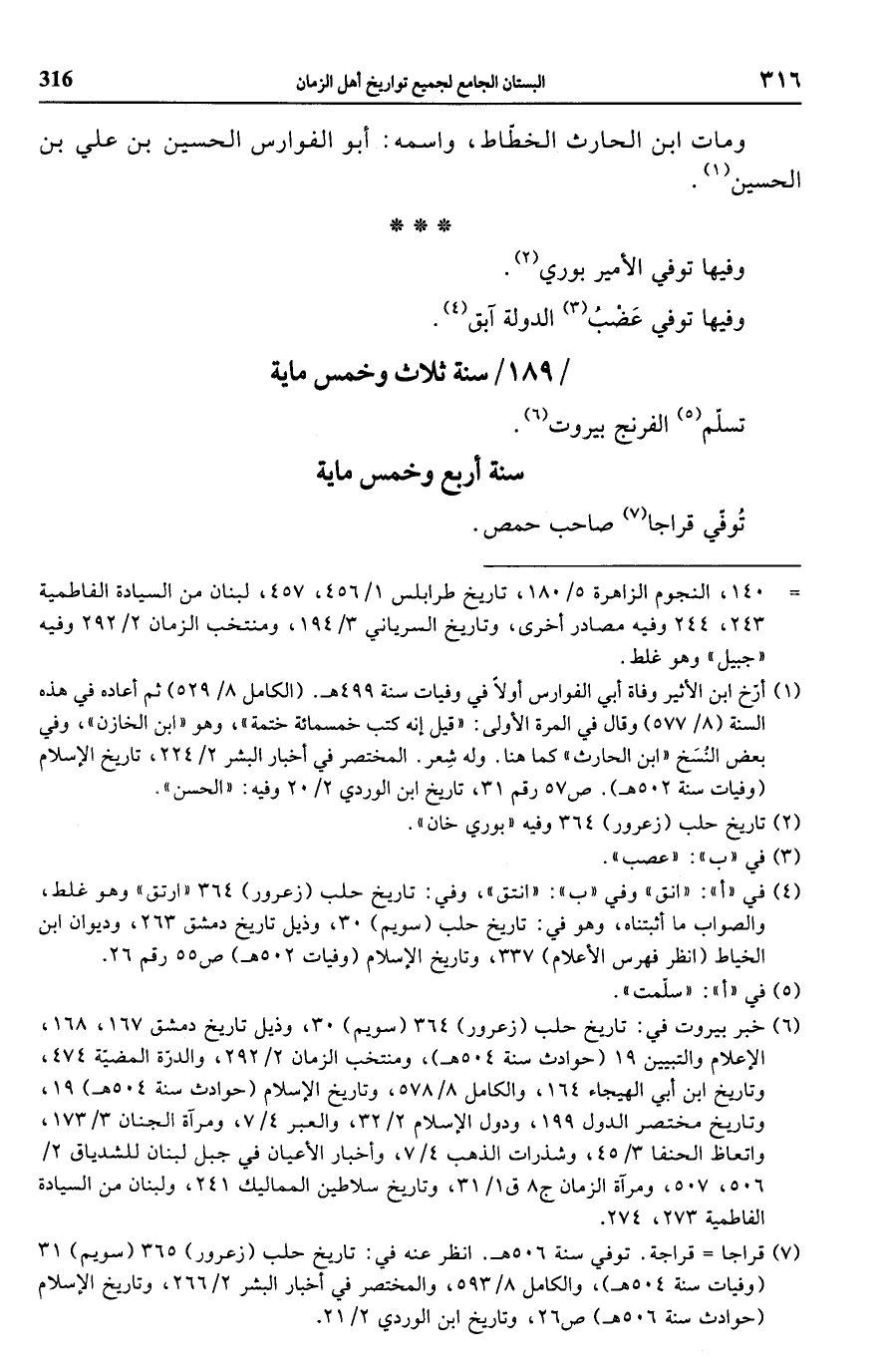 (¬6) خبر بيروت في: تاريخ حلب (زعرور) 364 (سويم) 30، وذيل تاريخ دمشق 167، 168، الإعلام والتبيين 19 (حوادث سنة 504 هـ)، ومنتخب الزمان 2/ 292، والدرّة المضيّة 474، وتاريخ ابن أبي الهيجاء 164، والكامل 8/ 578، وتاريخ الإسلام (حوادث سنة 504 هـ) 19، وتاريخ مختصر الدول 199، ودول الإسلام 2/ 32، والعبر 4/ 7، ومرآة الجنان 3/ 173، واتعاظ الحنفا 3/ 45، وشذرات الذهب 4/ 7، وأخبار الأعيان في جبل لبنان للشدياق 2/ 506، 507، ومرآة الزمان ج 8 ق 1/ 31، وتاريخ سلاطين المماليك 241، ولبنان من السيادة الفاطمية 273، 274.