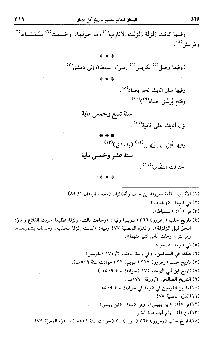 (¬4) تاريخ حلب (زعرور) 366 (سويم) وفيه: "وجاءت بالشام زلزلة عظيمة خربت القلاع واسوَدّ الجوّ قبل الزلزلة"، والدرّة المضيّة 477 وفيه: "كانت زلزلة بحلب، وخسف بشميصاط ومرعش، وهلك أناس كثير منهما".