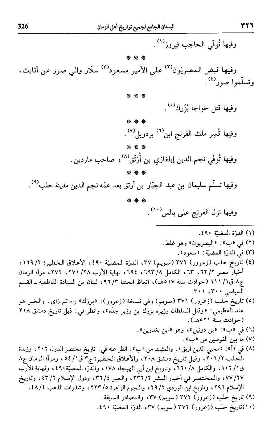 (¬5) تاريخ حلب (زعرور) 371 (سويم) وفي نسخة (زعرور): "برزك" راء ثم زاي. والخبر هو عند العظيمي: "وقتل السلطان وزيره بزرك بن وزير جدّه"، وانظر في: ذيل تاريخ دمشق 218 (حوادث سنة 521 هـ).