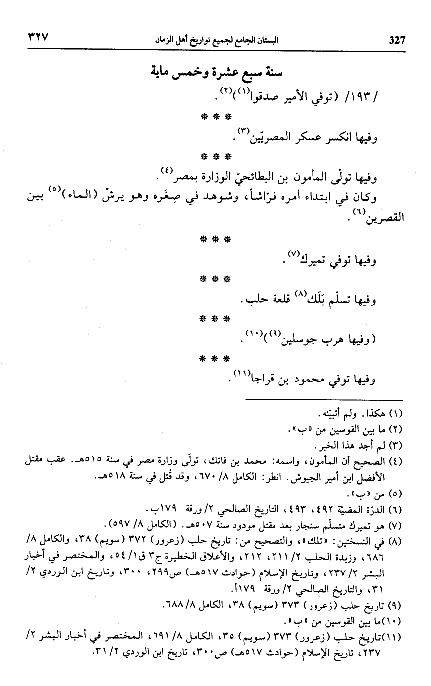 (¬11) تاريخ حلب (زعرور) 373 (سويم) 35، الكامل 8/ 691، المختصر في أخبار البشر 2/ 237، تاريخ الإسلام (حوادث 517 هـ) ص 300، تاريخ ابن الوردي 2/ 31.