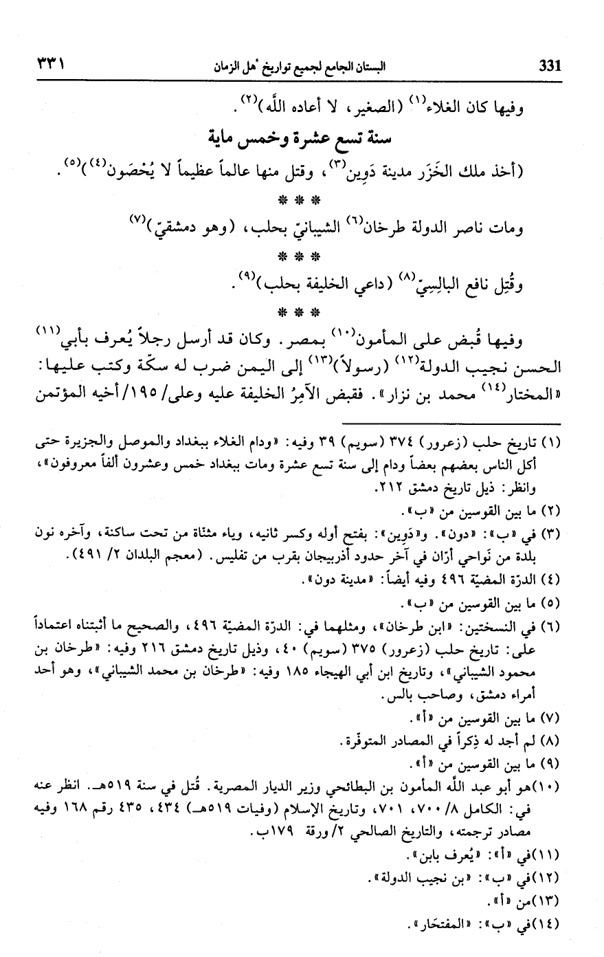 (¬1) تاريخ حلب (زعرور) 374 (سويم) 39 وفيه: "ودام الغلاء ببغداد والموصل والجزيرة حتى أكل الناس بعضهم بعضًا ودام إلى سنة تسع عشرة ومات ببغداد خمس وعشرون ألفًا معروفون"، وانظر: ذيل تاريخ دمشق 212.