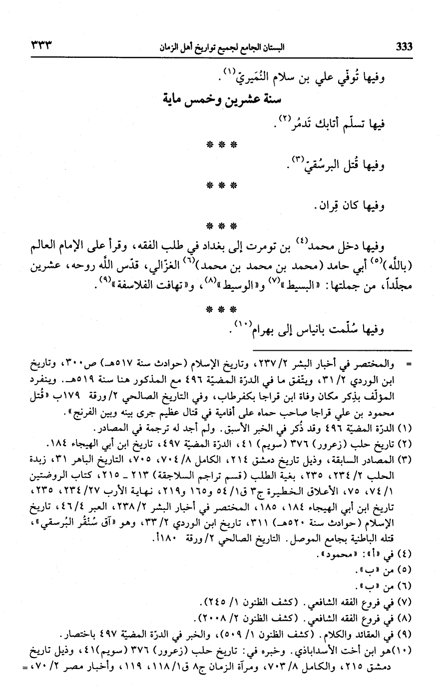 وفيها دخل محمد (¬4) بن تومرت إلى بغداد في طلب الفقه، وقرأ على الإمام العالم (بالله) (¬5) أبي حامد (محمد بن محمد بن محمد) (¬6) الغزّالي، قدّس الله روحه، عشرين مجلّدًا، من جملتها: "البسيط" (¬7) و "الوسيط" (¬8)، و "تهافت الفلاسفة" (¬9).