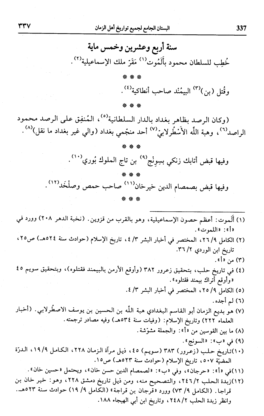 (¬2) الكامل 9/ 26، المختصر في أخبار البشر 3/ 4، تاريخ الإسلام (حوادث سنة 524 هـ) ص 25، تاريخ ابن الوردي 2/ 36.