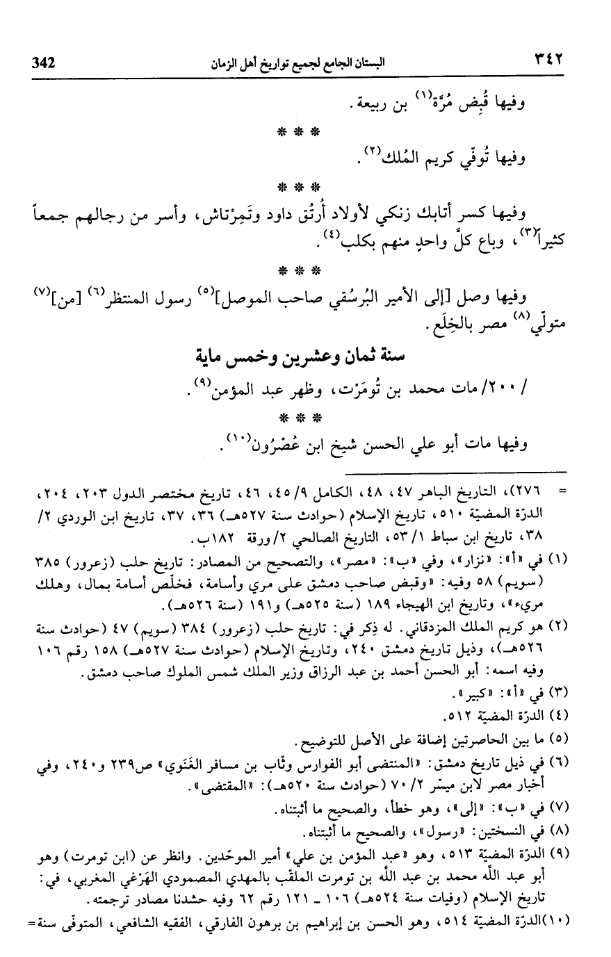 (¬6) في ذيل تاريخ دمشق: "المنتضى أبو الفوارس وثاب بن مسافر الغَنَوي" ص 239 و 240، وفي أخبار مصر لابن ميسر 2/ 70 (حوادث سنة 520 هـ): "المقتضى".