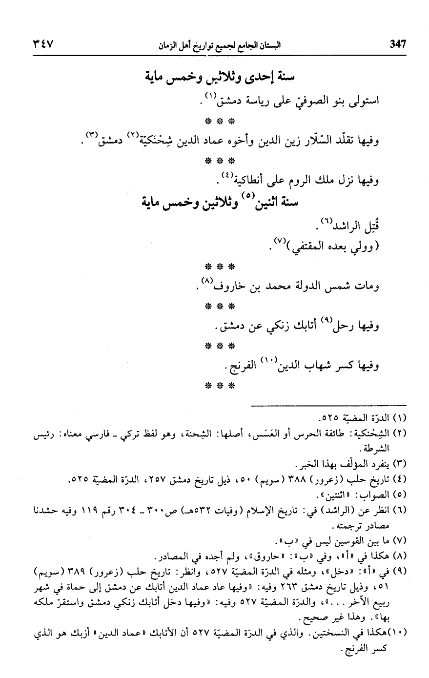 (¬9) في "أ": "دخل"، ومثله في الدرّة المضيّة 527، وانظر: تاريخ حلب (زعرور) 389 (سويم) 51، وذيل تاريخ دمشق 263 وفيه: "وفيها عاد عماد الدين أتابك عن دمشق إلى حماة في شهر ربيع الآخر ... "، والدرّة المضيّة 527 وفيه: "وفيها دخل أتابك زنكي دمشق واستقرّ ملكه بها". وهذا غير صحيح.