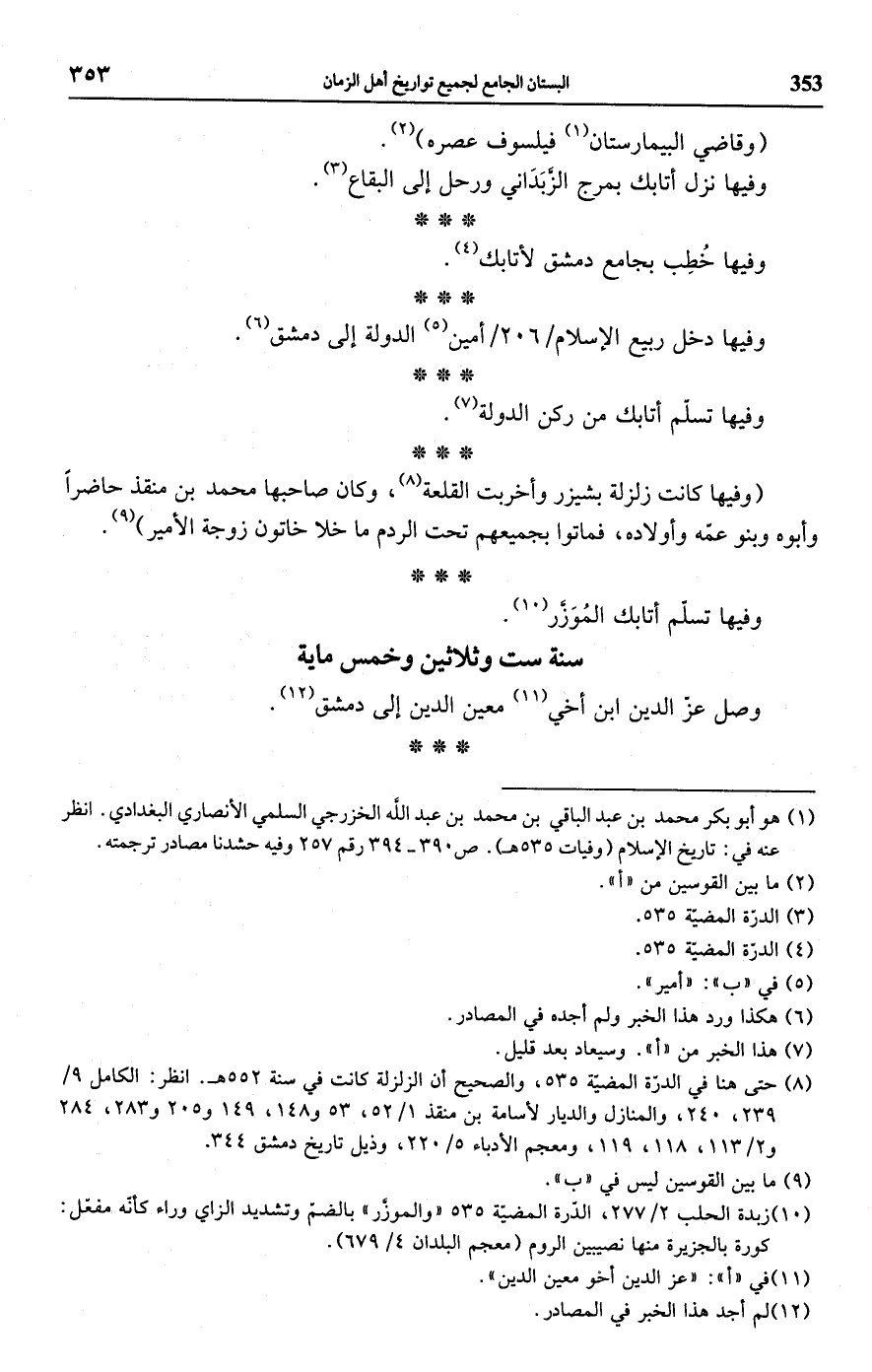 (¬8) حتى هنا في الدرّة المضية 535، والصحيح أن الزلزلة كانت في سنة 552 هـ. انظر: الكامل 9/ 239، 240، والمنازل والديار لأسامة بن منقذ 1/ 52. 53 و 148، 149 و 205 و 283، 284 و 2/ 113، 118، 119، ومعجم الأدباء 5/ 220، وذيل تاريخ دمشق 344.