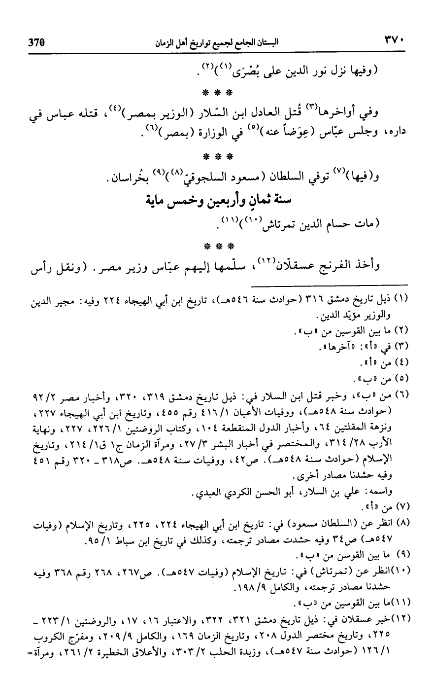 (¬12) خبر عسقلان في: ذيل تاريخ دمشق 321، 322، والاعتبار 16، 17، والروضتين 1/ 223 - 225، وتاريخ مختصر الدول 208، وتاريخ الزمان 169، والكامل 9/ 209، ومفرّج الكروب 1/ 126 (حوادث سنة 547 هـ)، وزبدة الحلب 2/ 303، والأعلاق الخطيرة 2/ 261، ومرآة=