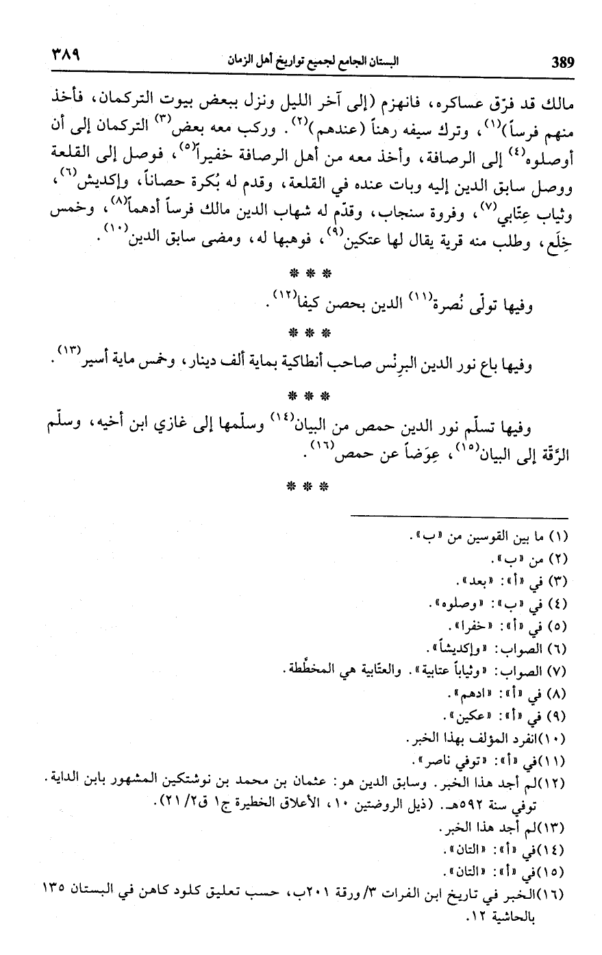 (¬16) الخبر في تاريخ ابن الفرات 3/ ورقة 201 ب، حسب تعليق كلود كاهن في البستان 135 بالحاشية 12.