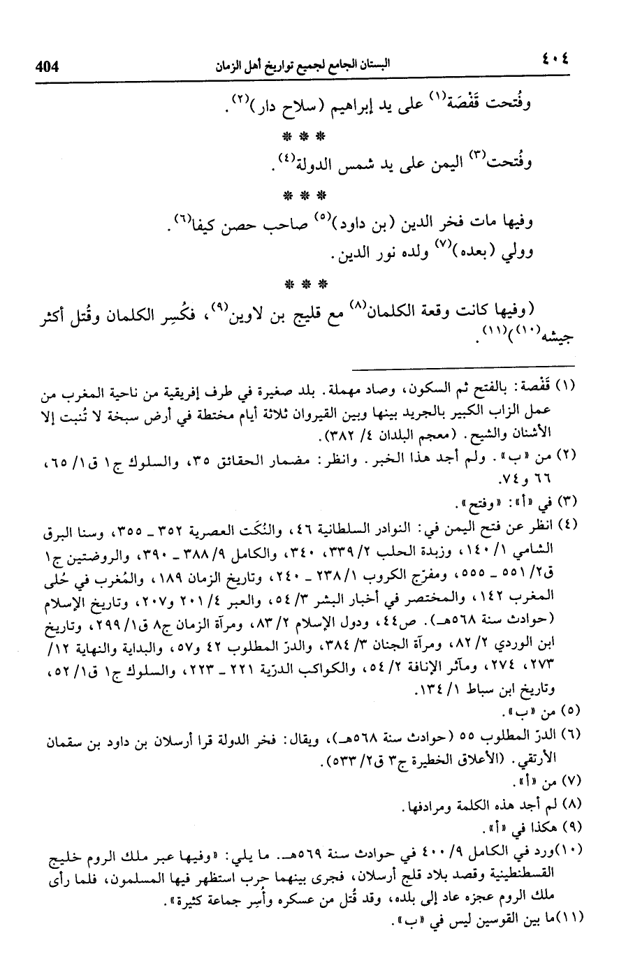 (¬10) ورد في الكامل 9/ 400 في حوادث سنة 569 هـ. ما يلي: "وفيها عبر ملك الروم خليج القسطنطينية وقصد بلاد قلج أرسلان، فجرى بينهما حرب استظهر فيها المسلمون، فلما رأى ملك الروم عجزه عاد إلى بلده، وقد قُتل من عسكره وأُسِر جماعة كثيرة".