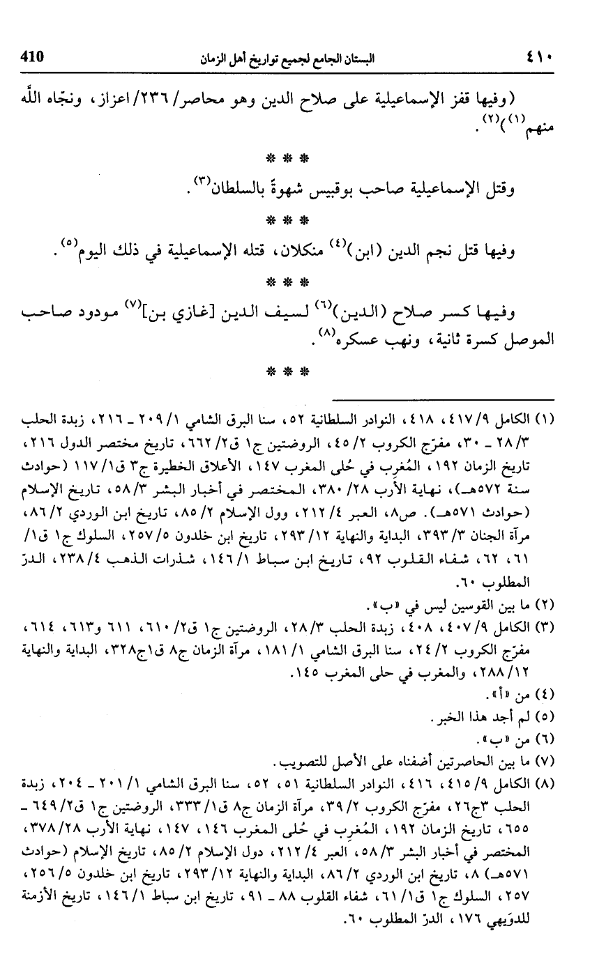 (¬3) الكامل 9/ 407، 408، زبدة الحلب 3/ 28، الروضتين ج 1 ق 2/ 610، 611 و 613، 614، مفرج الكروب 2/ 24، سنا البرق الشامي 1/ 181، مرآة الزمان ج 8 ق 1 ج 328، البداية والنهاية 12/ 288، والمغرب في حلى المغرب 145.