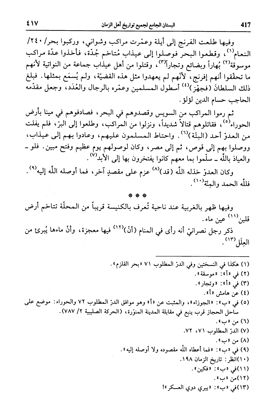 ثم رموا المراكب من السويس وقصدوهم في البحر، فصادفوهم في مينا بأرض الحوراء (¬5)، فقاتلوهم قتالًا شديدًا، ونزلوا من المراكب، وطلعوا إلى البر، فلم يفلت من العدو أحد (البتّة) (¬6). واحتاط المسلمون عليهم، وعادوا بهم إلى عيذاب، ووصلوا بهم إلى قوص، ثم إلى مصر، وكان لوصولهم يوم عظيم وفتح مبين. فلو -والعياذ بالله- سلموا بما معهم كانوا يفتخرون بها إلى الأبد (¬7).