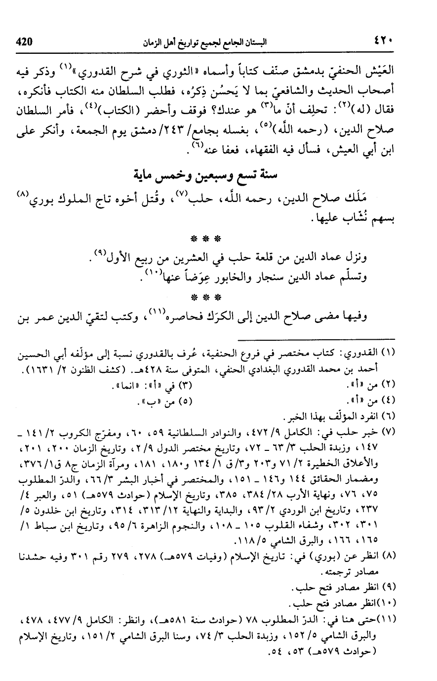 (¬11) حتى هنا في: الدرّ المطلوب 78 (حوادث سنة 581 هـ)، وانظر: الكامل 9/ 477، 478، والبرق الشامي 5/ 152، وزبدة الحلب 3/ 74، وسنا البرق الشامي 2/ 151، وتاريخ الإسلام (حوادث 579 هـ) 53، 54.
