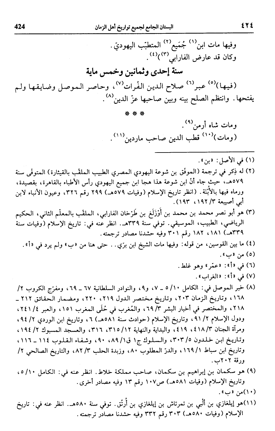 (¬8) خبر الموصل في: الكامل 10/ 5 - 7، و 9، والنوادر السلطانية 67 - 69، ومفرّج الكروب 2/ 168، وتاريخ الزمان 203، وتاريخ مختصر الدول 219، 220، ومضمار الحقائق 212 - 218، والمختصر في أخبار البشر 3/ 69، والمُغرب في حُلَى المغرب 151، والعبر 4/ 241، ودول الإسلام 2/ 91، وتاريخ الإسلام (حوادث سنة 581 هـ) 6، وتاريخ ابن الوردي 2/ 94، ومرآة الجنان 3/ 418، 419، والبداية والنهاية 12/ 315، 316، والعسجد المسبوك 2/ 194، وتاريخ ابن خلدون 5/ 303، والسلوك ج 1 ق 1/ 89، 90، وشفاء القلوب 114 - 116، وتاريخ ابن سباط 1/ 169، والدر المطلوب 80، وزبدة الحلب 3/ 82، والتاريخ الصالحي 2/ ورقة 202 ب.